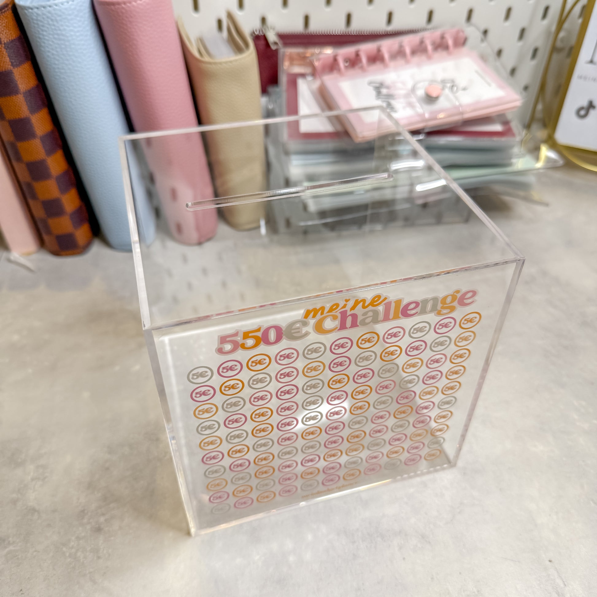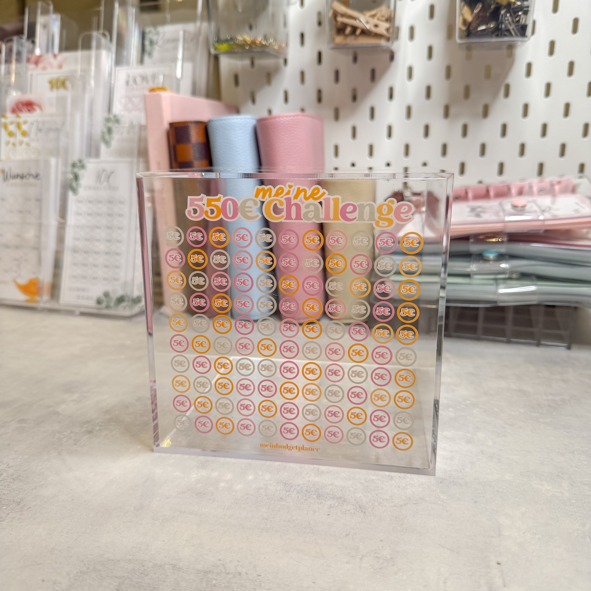 Eine neue Challenge ist ins Sortiment gezogen. Die 550,00€ Challenge ist eine Acrylbox, die du nach dem sparen ganz einfach aufbrechen kannst. Somit kommst du nicht ran, bevor du nicht den gesamten Betrag gespart hast.